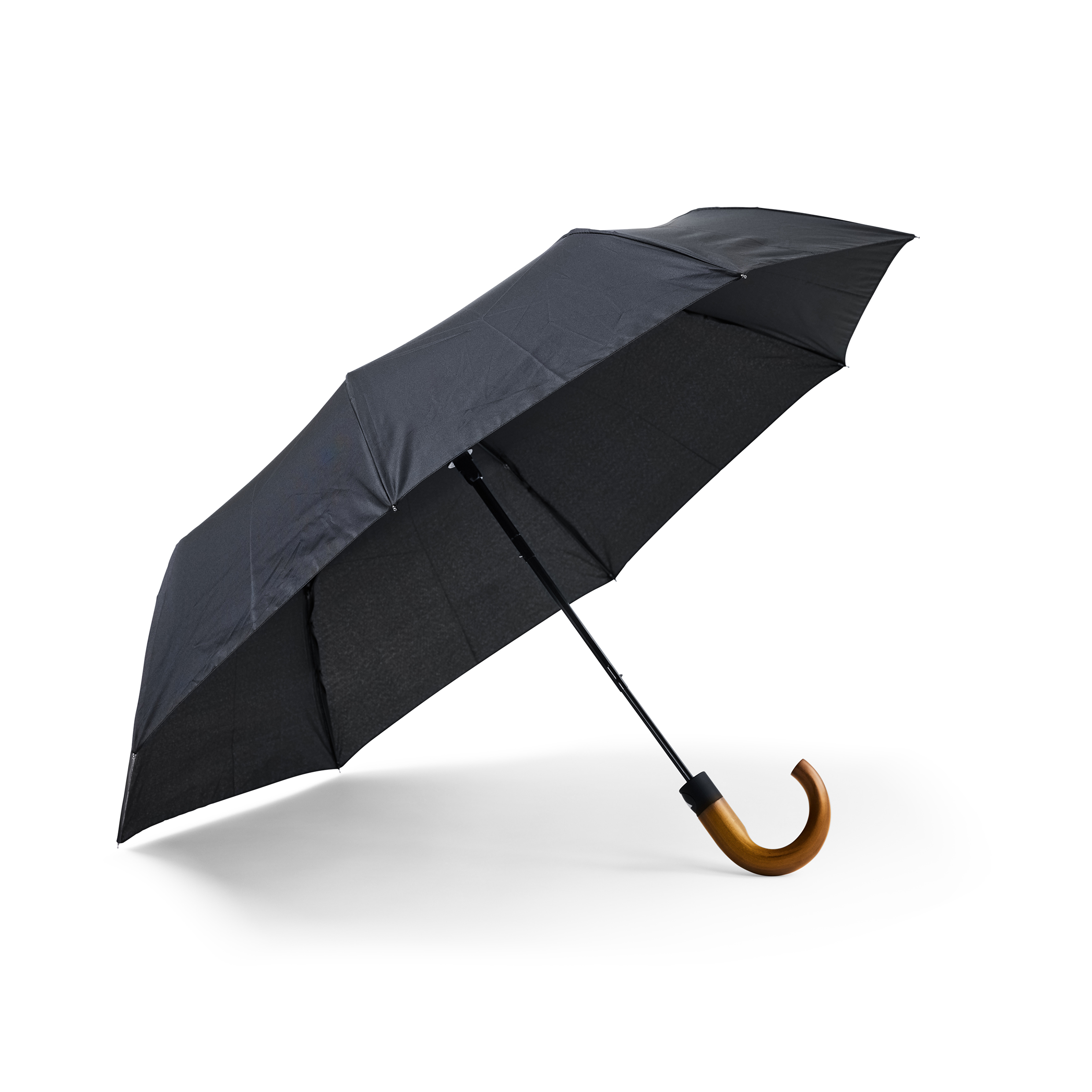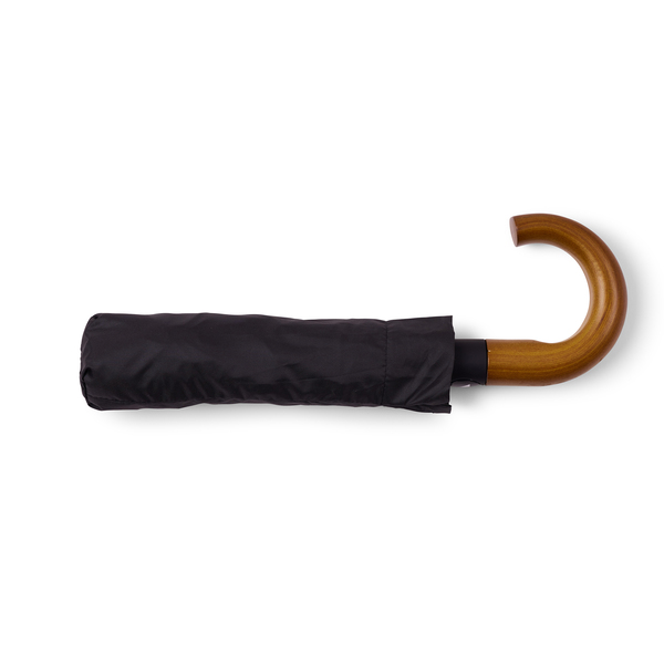 Article No. 20444602NEW! Bend is a sturdy compact umbrella with a solid wooden crook handle. What makes it special is that it is completely PFAS-free and made with care for both people and the environment. Instead of the traditional water-repellent treatment, an eco-friendly method without harmful chemicals is used – just as effective against rain, but much kinder to nature. The umbrella features panels made of R-PET fabric, providing a lower climate footprint and a more sustainable life cycle. The metal frame combined with graphite and fiberglass ribs at the tips makes the construction stronger and more resistant to wind. The panels are reversible, adding both function and style. Bend has an automatic opening mechanism and a three-section black steel shaft, making it practical, durable, and easy to carry wherever you go.