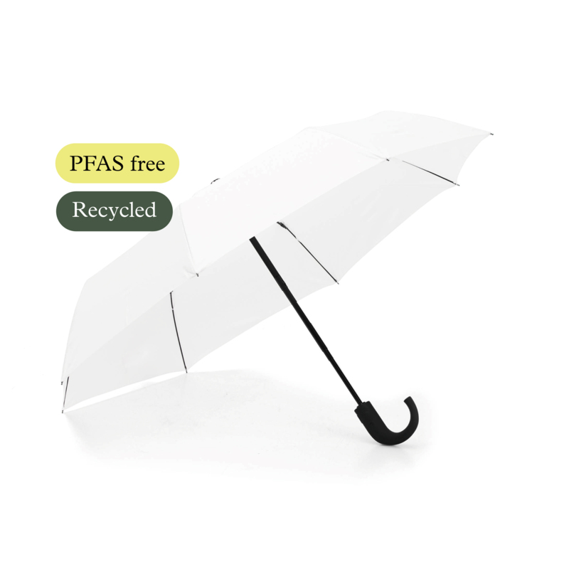Article No. 20455200NEW! Breeze is a sleek umbrella that combines modern technology with a timeless silhouette. What makes it special is that it is completely PFAS-free and made with care for both people and the environment. Instead of the traditional water-repellent treatment, an eco-friendly method without harmful chemicals is used – just as effective against rain, but much kinder to nature. The umbrella features panels made of R-PET fabric, providing a lower climate footprint and a more sustainable life cycle. With its automatic open-and-close mechanism, Breeze is easy to handle even when your hands are full – one press is all it takes to smoothly open or close the umbrella. The classic J-shaped rubber-coated handle offers a secure and comfortable grip while adding an elegant touch. With a diameter of 97 cm, Breeze provides generous rain protection yet remains compact, folding down to just 33 cm – perfect to carry in your bag or briefcase. The strong metal shaft and flexible fiberglass ribs make the umbrella storm-resistant and ready for rough weather.