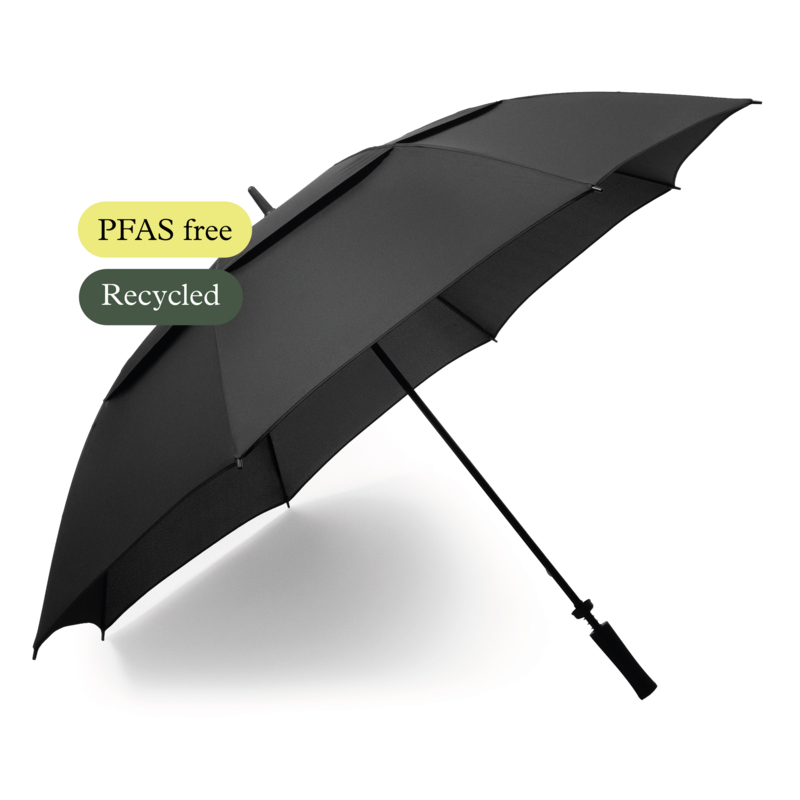 Article No. 20524600NEW! Golf Umbrella Tour – an exclusive, premium-class golf umbrella designed for maximum protection and long-lasting durability. Tour is completely PFAS-free and developed with care for both people and the environment. Instead of traditional water-repellent chemical treatments, we use an alternative method free from harmful chemicals. The panels are made from recycled R-PET fabric, resulting in a lower carbon footprint and a more sustainable product lifecycle. With an impressive 150 cm diameter, Tour provides generous rain coverage for both you and your equipment. Its 109 cm length offers ample height, making the umbrella practical and functional when mounted on a golf bag. The robust fiberglass shaft and flexible fiberglass ribs deliver superior strength and durability, while smart air vents ensure storm resistance even in strong winds. Manual opening adds a classic feel, and the straight rubberized handle with premium finish features a non-slip surface for a secure grip. The handle is designed to fit all standard golf trolley umbrella holders. Tour is the golf umbrella for those seeking exceptional quality, refined design, and reliability in all weather conditions. Accessory: Enhance the premium feel with an optional protective and practical umbrella sleeve.