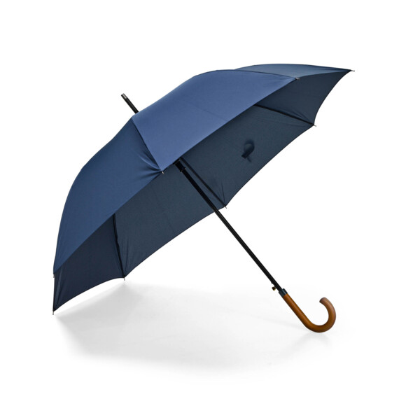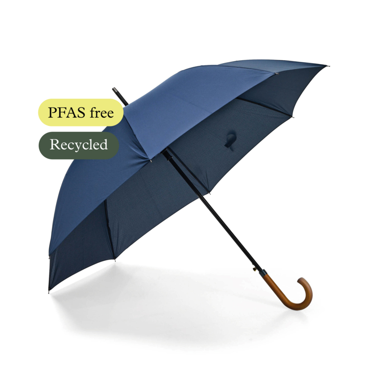 Material PFAS-free, R-PET Pongee fabric, fiberglass ribs, metal shaft, wooden handle