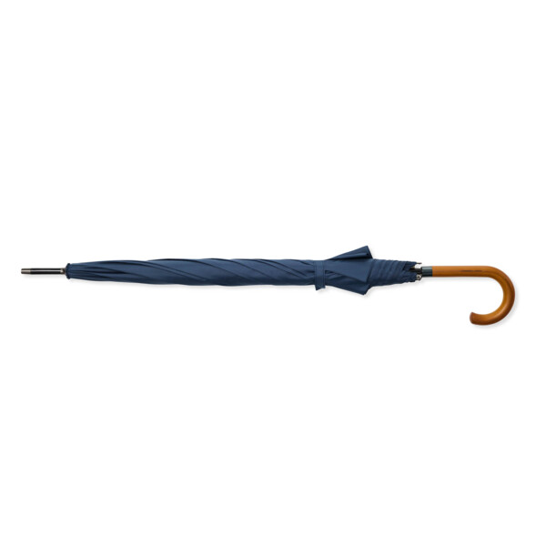 NEW! Grace is a sleek umbrella that combines modern technology with timeless design. What makes it special is that it is completely PFAS-free and made with care for both people and the environment. Instead of the traditional water-repellent treatment, an eco-friendly method without harmful chemicals is used – just as effective against rain, but much kinder to nature. The umbrella features panels made of R-PET fabric, providing a lower climate footprint and a more sustainable life cycle. With its fiberglass ribs and sturdy metal shaft, Grace is both wind-resistant and stable. The classic J-shaped wooden handle offers a comfortable grip while adding an elegant touch. With a generous diameter of 120 cm, Grace provides ample rain protection without being bulky – perfectly balanced between a golf umbrella and a standard model. The automatic opening mechanism allows the umbrella to open quickly with just one press, making it easy to use even when your hands are full. The shaft, tips, and top are made of black lacquered metal, giving it a sleek and durable finish. Grace is a popular choice in law offices, hotel lobbies, and everywhere style and reliability matter.