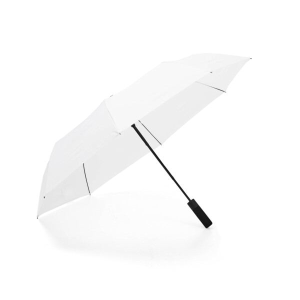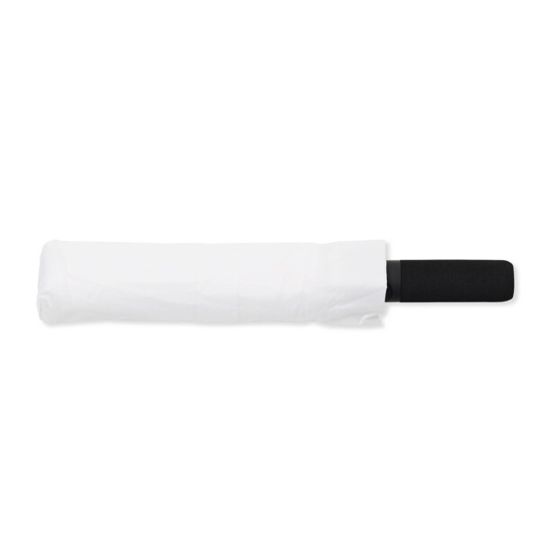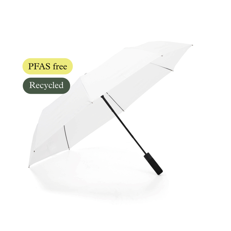 Article No. 20485200NEW! Wrap is a storm-resistant compact umbrella that combines function, design, and sustainability. What makes it special is that it is completely PFAS-free and made with care for both people and the environment. Instead of the traditional water-repellent treatment, an eco-friendly method without harmful chemicals is used – just as effective against rain, but much kinder to nature. The umbrella features panels made of R-PET fabric, providing a lower climate footprint and a more sustainable life cycle. Wrap is the perfect choice for those who want a reliable, foldable umbrella that can handle both everyday use and rough weather. With a generous diameter of 100 cm, it offers dependable rain protection, and thanks to its compact folded size of only 36 cm, it easily fits in your bag, backpack, or coat pocket – always ready when the rain starts to fall. The straight, ergonomic handle made of soft EVA foam provides a comfortable grip. With automatic opening, the umbrella unfolds at the press of a button – quick, smooth, and practical. The durable metal shaft and flexible fiberglass ribs give the umbrella a wind-resistant construction, built to withstand even strong gusts of wind without turning inside out.