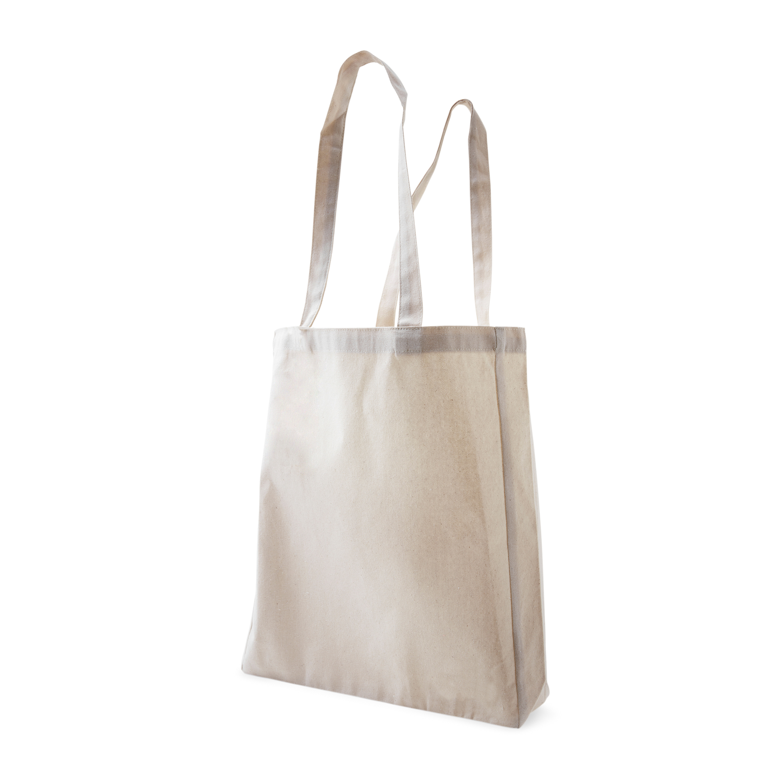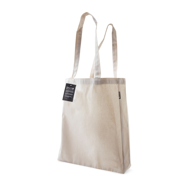 This cotton bag is made of 250 gram recycled cotton. The bag features a sewn-on "Recycle" label on one side. A hanging tag,