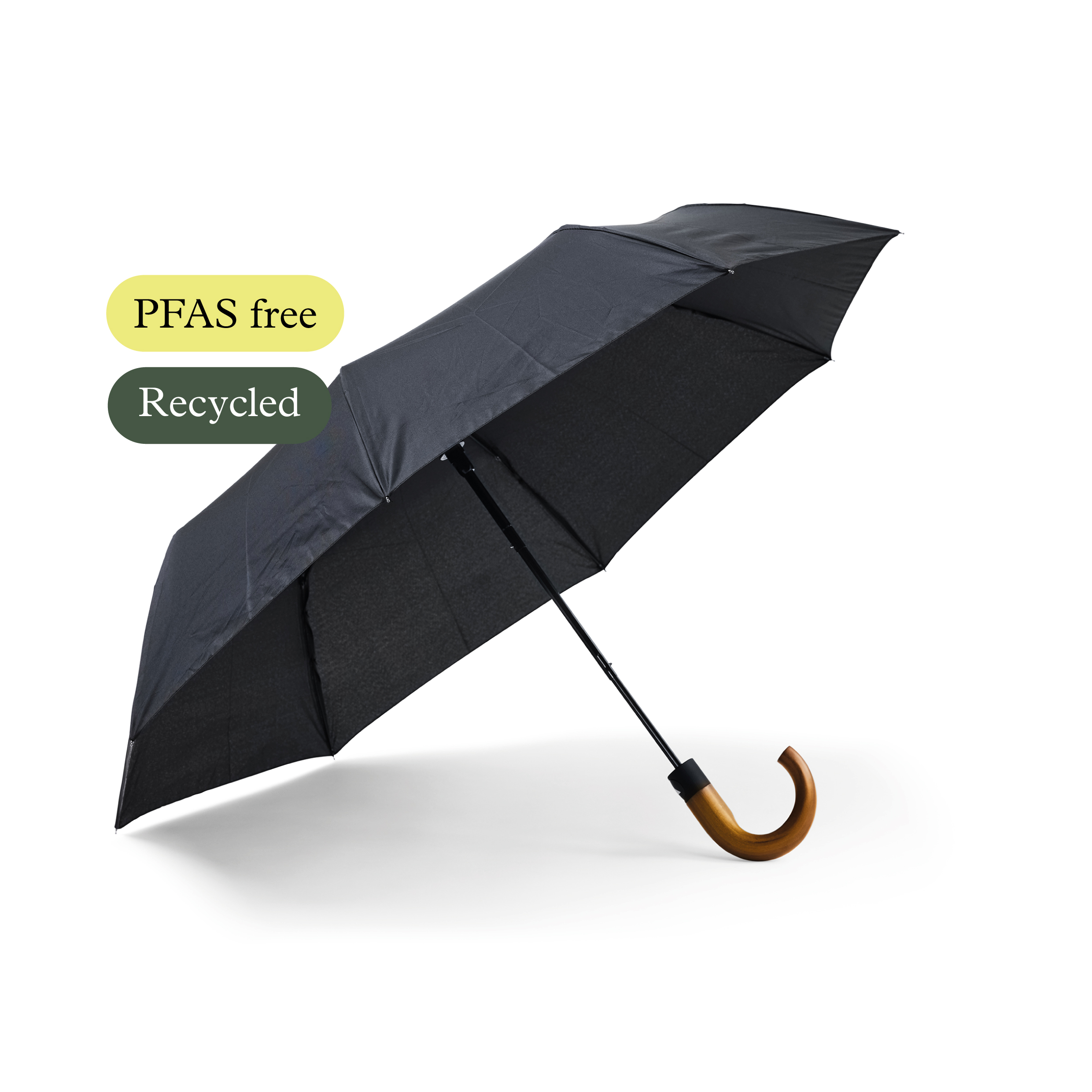 Article No. 20444602NEW! Bend is a sturdy compact umbrella with a solid wooden crook handle. What makes it special is that it is completely PFAS-free and made with care for both people and the environment. Instead of the traditional water-repellent treatment, an eco-friendly method without harmful chemicals is used – just as effective against rain, but much kinder to nature. The umbrella features panels made of R-PET fabric, providing a lower climate footprint and a more sustainable life cycle. The metal frame combined with graphite and fiberglass ribs at the tips makes the construction stronger and more resistant to wind. The panels are reversible, adding both function and style. Bend has an automatic opening mechanism and a three-section black steel shaft, making it practical, durable, and easy to carry wherever you go.