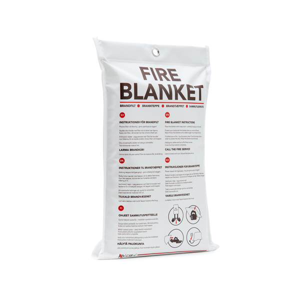Brandfilt av glasfiberväv godkänd enligt EN 1869:2019. Filten är 120 x 120 cm. Fodralen finns i tre olika färger, röd, vit och svart. Instruktioner på baksidan på svenska, norska, danska, finska och engelska.