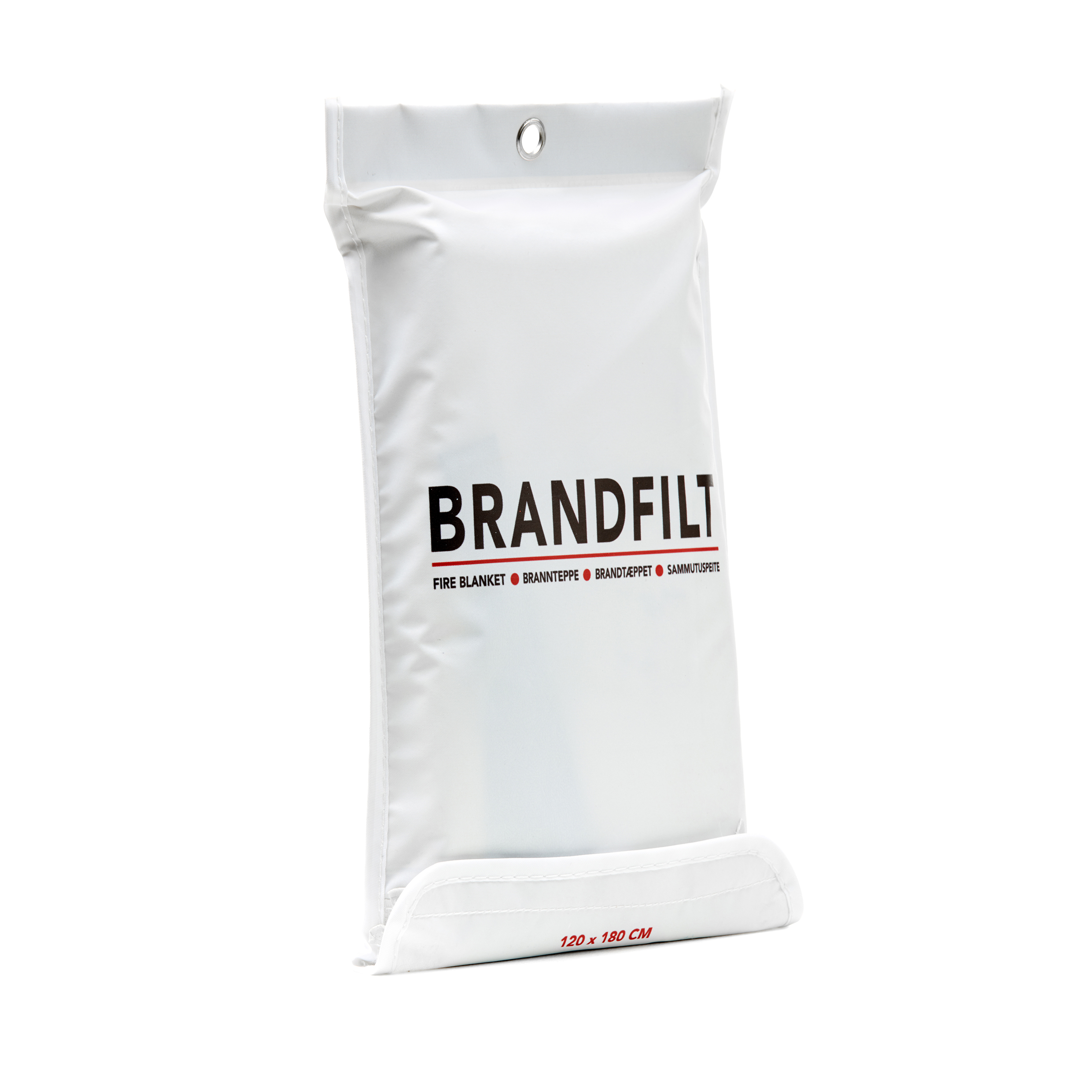 Brandfilt av glasfiberväv godkänd enligt EN 1869:2019. Fodralen finns i tre olika färger; röd, vit, svart. Instruktioner på